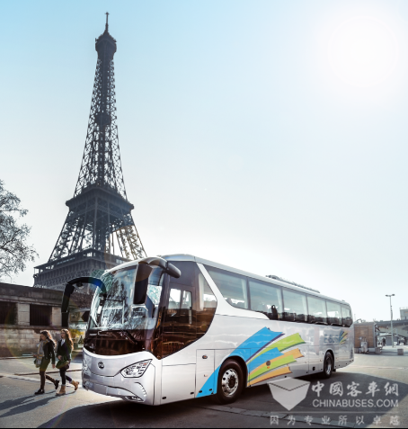 比亚迪研发的世界首台纯电动旅游客车在巴黎艾菲尔铁塔的见证下亮相欧洲