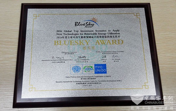 2016年6月17日,联合国工业发展组织授予银隆新能源钛酸锂电池“全球可再生能源领域最具投资价值的领先技术蓝天奖”(以下简称蓝天奖)。
