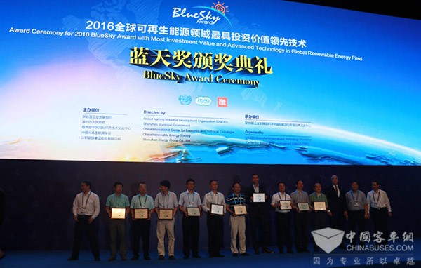 国务院参事、中国可再生能源学会理事长石定寰先生为银隆新能源颁发奖项 “蓝天奖”是由联合国工业发展组织、商务部中国国际技术交流中心、深圳市人民政府、中国可再生能源学会、深圳能源集团股份有限公司共同主办、深圳国际能源与环境技术促进中心组织承办的一项国际评选活动,至今已成功举办了五届。该奖项征集范围限于清洁能源利用领域的技术,包括太阳能、风能等新能源创新技术在节能减排、生态环保领域的创新应用,旨在引导可再生能源在发展中国家规模化应用,以缓解常规化石能源供应短缺以及温室气体效应对全球气候的影响。本届在深圳举行,获奖技术将通过网站、快讯、出版物等新闻媒体以及联合国工业发展组织网络向全球进行推广。