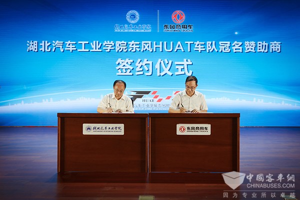 在发车仪式前,湖北汽车工业学院分别与车队独家冠名赞助商东风商用车有限公司、车队白金合作伙伴风神轮胎股份有限公司进行了签约仪式。