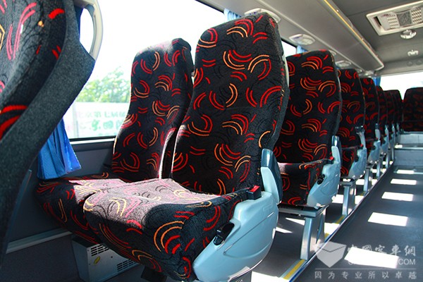 进入车内,新锦程的乘客区让人不禁眼前一亮。它拥有同级别车型最大座位数,9 m车型高一级可达38座(37+1),但座位数并不是靠压缩座椅空间获得,而是通过优化布置方案和提高空间利用率。它的内部高度、过道宽度以及座椅空间,都会给人一种收放自如之感,而实际测量的一组数据也证实了新锦程在空间方面的优势:1960mm内高,2 400 mm的内宽,车内过道宽度570 mm,坐垫至顶部高度1080 mm,前后座椅间距720 mm,相邻座椅可调间距105 mm,最后一排座椅的坐垫至顶部高度1235 mm。