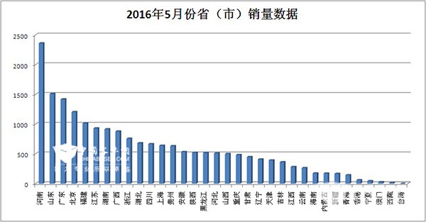 总结:2016年前五个月客车市场,宇通、厦门金龙、福田欧辉领先,宇通保持着绝对优势。“三龙两通”占据超半数客车市场份额,主流客车占据大部分市场的局面未有改变。值得注意的是,福田欧辉超越金旅,跻身市场销量前三;在5月份销量最多的地区河南2360辆,宇通客车占据1651 辆。