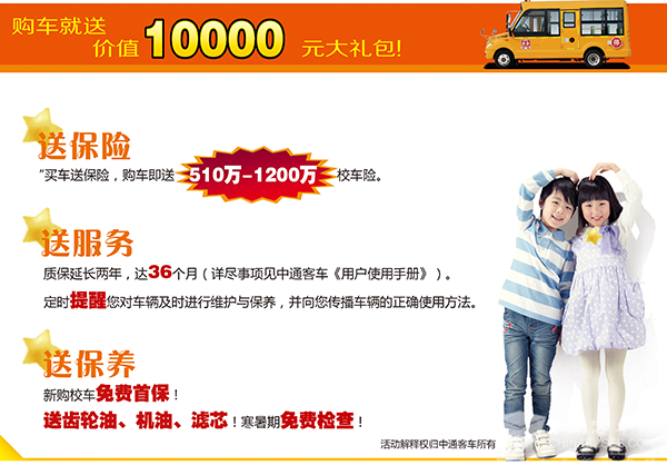 据悉,此次“蜂行一夏”活动持续时间为2016年6月至9月,涵盖整个暑期,在此期间购车,不仅能够享受优惠价格,还能享受购车就送一万元大礼包。在售后方面,中通客车的校车质保时限延长至36个月,并实行免费首保,赠送齿轮油、机油、滤芯,赠送寒暑假免费检查。