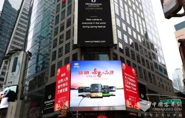 2012年安凯双层观光车在伦敦运营 而且,在2016年中国农历新年期间,安凯客车登陆纽约时代广场刷屏贺新春,邀请全球人民一起过农历新年,向全世界展示中国品牌实力,为“中国制造”代言。