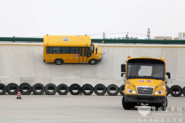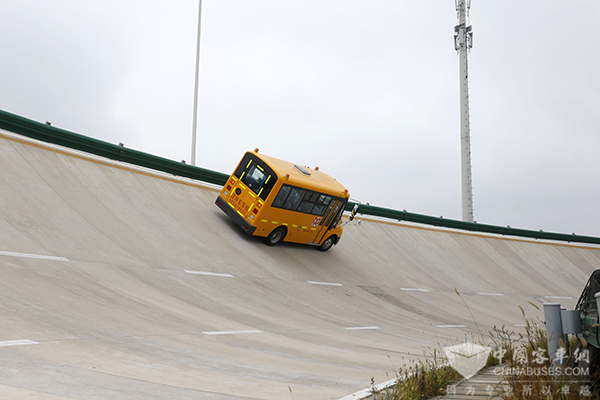 平稳驶过45°倾斜的路面,轻松爬上高4层楼、成30°角的高坡,再平稳下坡,整个试车过程虽不说惊险万分,但还是把围观的人惊出了一身冷汗。宇通驾驶员、质检员深知,完成这样高难度动作的危险性有多大,但为了孩子们的乘车安全,他们宁愿冒着这样的危险以检验每一辆新校车的安全性能。