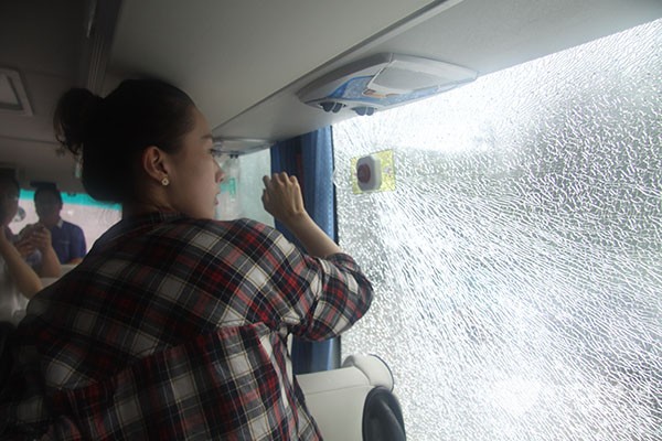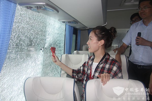 为了使网友了解破窗知识,工作人员先后使用乘客随身携带的金属皮带头、保温杯、手机等物品敲击车窗,更有工作人员尝试用双脚猛踹玻璃,欧辉客车的玻璃毫无破损迹象,可见以上破窗方式都不正确。女主播再次出镜,在了解安全锤破窗方法后,只见她扬起手中的安全锤敲向后窗玻璃,只听“砰”的一声,车后方的玻璃瞬间全部开裂,玻璃出现整片裂纹,同样,没有向外喷溅玻璃渣,紧急遇险情形这才是开启生命之门的有效方法。
