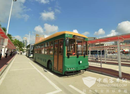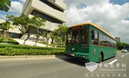 新能源客车调研小组领导们一同试乘银隆新能源仿古“铛铛车“ 新能源汽车加快珠海绿色生态城市建设步伐