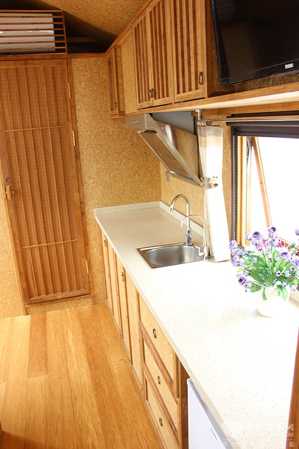 在车辆设施方面:配备密码门锁、24小时安保监控系统;内部空间整体划分为休息区、娱乐休闲区、厨房区、卫浴区等四个部分,配置加宽双人大床、衣柜、床头柜、卡座(可折叠成床)、灶台、吊柜、抽屉、鞋柜、干湿分离卫生间、洗手池等设备;在生活保障方面配置了壁挂式空调、电热水器、冰箱、液晶电视、油烟机、净水器等;设施齐全,舒适温馨。