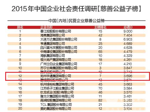2016年7月29日,由《南方周末》主办的“第八届中国企业社会责任年会”在北京隆重举行。宇通凭借企业超卓的综合实力,以及多年来对社会贡献方面的不懈努力,在“2015年中国(内地)民营企业创富榜”中取得了第7名的优异成绩,“2015年中国企业社会责任调研【慈善公益子榜】”中取得第12名的成绩,并荣膺2015年“最佳责任企业”称号。
