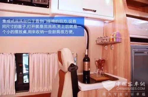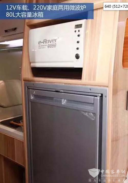 车内浣洗池足够平时使用,池子上方的储物柜空间比较大,左侧还有微波炉和冰箱。区域划分的十分合理,一个人就能完成料理的所有事情。