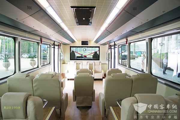 五洲龙此番不但采用了全承载式铝型材车身、异型钢管焊接式车架,满足低碳、环保、轻量化的时代发展趋势,还采用了进口桦木地板,抗倍特侧壁板,冲孔铝塑顶棚板,使整车具有耐水、耐腐蚀、表面抗老化等特点。而为了应对海外高端用户的需求,内饰也采用欧洲低地板公交车的内装饰风格也在所难免。