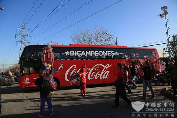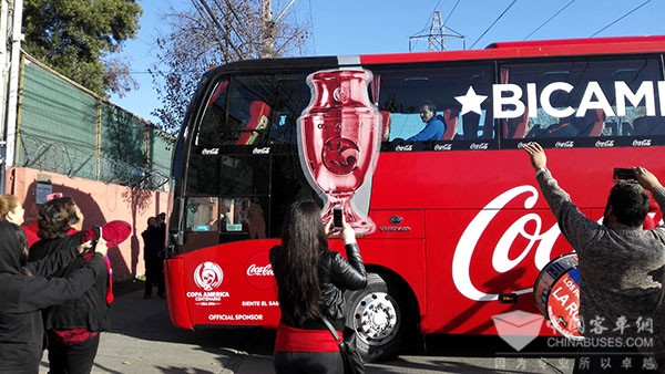2016年6月26日晚,智利足球队以点球大战战胜阿根廷队,蝉联美洲杯冠军。在举国欢庆迎接载誉而归的智利国家足球队现场,足球队员乘坐的专属座驾——宇通客车,为“中国制造”在智利做足了形象。