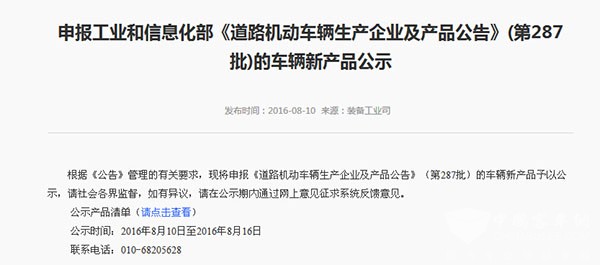 2016年8月10日,工信部发布第287批《道路机动车辆生产企业及产品公告》申请企业车辆新产品公示。共有236款新能源客车申报第287批产品公告,其中纯电动客车占197款,插电式混合动力(含混合动力)占39款。