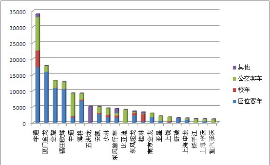 由图看出,宇通占据国内校车市场绝对优势,其中,桂林客车、东风超龙在校车市场表现突出。未来,校车市场将有巨大潜力。