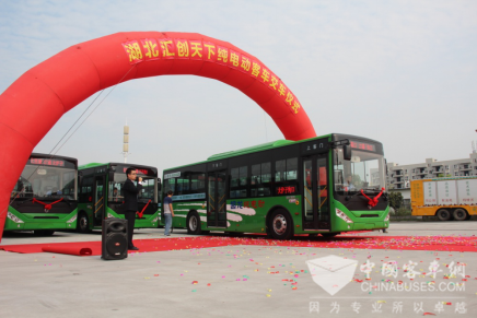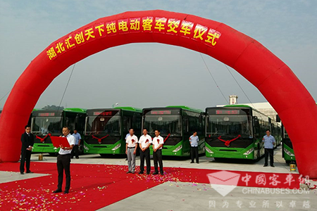 在这收获的季节,东风超龙向湖北汇创天下交付首批30辆EQ6105CBEVT纯电动公交的交车仪式于2016年8月29日举行。