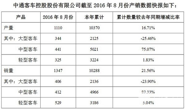 中通客车2016年8月份产销快报
