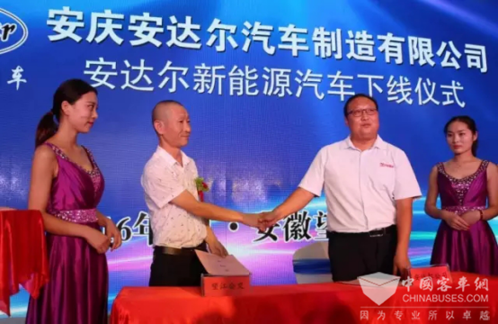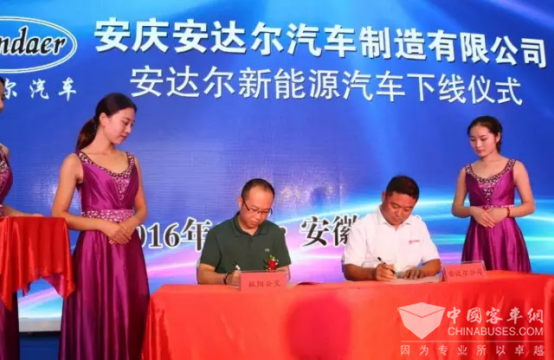 安达尔新能源汽车四款车型的顺利下线得到了各级政府领导及广大用户的肯定与认可。本次活动中,安达尔公司先后与望江县公交公司、桐城市公交公司、潜山县公交公司及枞阳县公交公司签订购车协议,共签约安达尔汽车订单240余辆。活动现场的陆续签约,市场投放的良好反响,充分彰显了安达尔新能源汽车的卓越品质及智能引领。