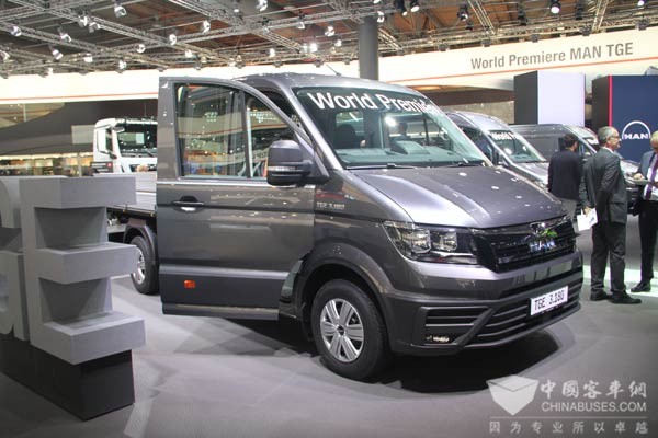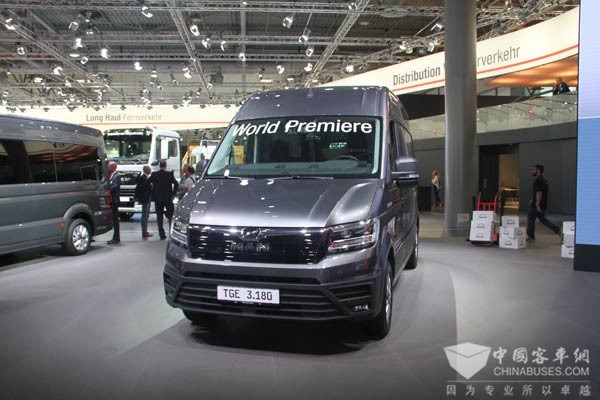 2016年 IAA 展会上的高潮是全新运输产品系列 MAN TGE 的全球首发。这款用于配送运输和建筑业的商用车允许总重为 3.0 - 5.5 吨,使曼恩成为了全面性的供应商。新款 MAN TGE 有大量可调整的个性化改型,此外还获得了最佳的总体拥有成本 (TCO) 以及高达 1.5 吨的有效载荷。耐久性、可靠性和节能性使这款新一代的柴油发动机十分出众,新款 MAN TGE 也具有这些特性,能在经济和生态方面均确保新的最佳值。同时,现代化的辅助系统可以提供最高的安全性以及已为人熟知的曼恩专业服务。