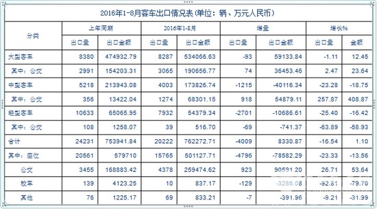 1—8月份,出口各类客车20222辆,出口金额70.23亿人民币,出口量比上年同期下降16.54%,出口额增长1.1%。客车出口在2009年跌至最低谷,金融危机以来,经过5年的上升周期之后,2014年客车出口规模扩大了近4倍,2015年开始调整以来,至今仍无转机。