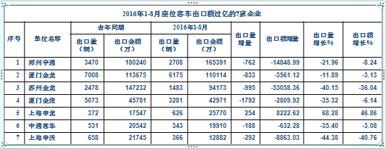 1、座位客车出口,主流企业都在下跌。1—8月份,座位客车出口量和出口额分别同比下降23.33%、13.56%,出口额超过亿元的共有7家企业,其中6家下降,只有一家增长。国内需求不足,新能源发展受阻,出口又如此低迷,座位客车的市场形势已相当严峻。