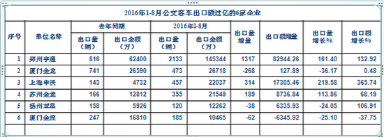 2、公交客车出口增幅较大,主要影响因素是上年基数较小。1—8月份,公交客车出口量和出口额分别增长26.71%、53.64%,主要影响因素是去年同期降幅太大,同比基数较小,今年的增长只是恢复性反弹。上年同期,公交客车出口量和出口额分别下降53.51%、46.36%,尽管今年有较大增幅,但与2014年同期相比仍然有很大差距(今年1-8月公交客车出口额26亿,2014年同期却有31亿,今年与前年相比,降幅仍有16%)。由于国内传统公交客车需求的大幅下滑,出口是延长现有产品生命周期的最佳途径,因此,做好公交客车出口,对客车企业来说就显得尤其重要。但是,纵观整个行业,公交出口确实尚有很大的提升空间,1-8月,超过亿元的只有6家,而宇通的出口额占全行业公交出口额的比例竟然高达56%,一方面说明宇通做得好,另一方面说明大家做得差。