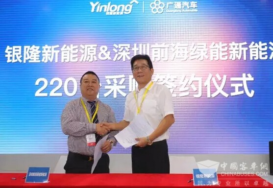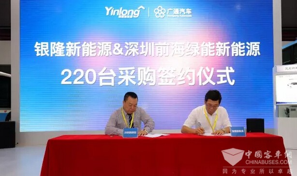 2016年9月25日,在“2016上海国际汽车用品交易会”现场,银隆集团常务副总裁敖建华与深圳前海绿能新能源汽车发展有限公司董事长刘勇共同签订了220台新能源客车的采购合同(含20辆仿古铛铛车)。本次签约具有重要意义,这标志着银隆新能源纯电动客车产品正式打进深圳特区市场,打响深圳第一炮。