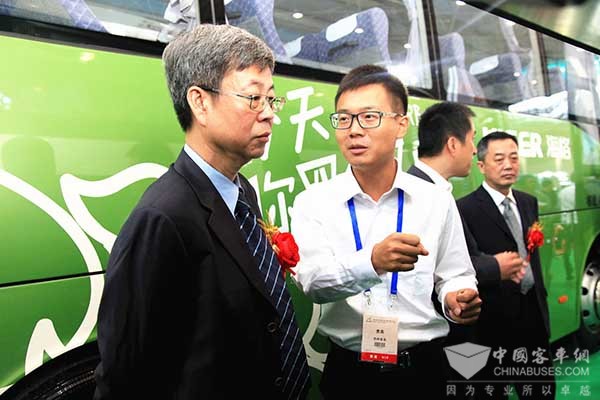 海格的多项创新技术和工艺不仅吸引了参观嘉宾的目光,也获得了业内“大咖”的赞赏。博览会现场,海格展位迎来了两位重量级嘉宾——交通运输部科学研究院院长石宝林、中国贸促会北京市分会副巡视员王超英。他们分别参观了KLQ6762全铝纯电动社区巴士、KLQ6852混动巴士。在参观KLQ6852混动巴士时,石宝林向海格技术工程师详细了解了该款车的性能,当听到海格客车采用了“硅油液外循环冷却系统”让电池保持在安全的温度范围内时,石宝林对海格客车持续深入研究新能源客车安全技术的行为十分赞赏,登上海格全铝纯电动社区巴士后,石宝林又仔细查看了车身内部构造。他对海格客车创新大胆的设计理念、精益求精的车身制造工艺竖起了“大拇指”。