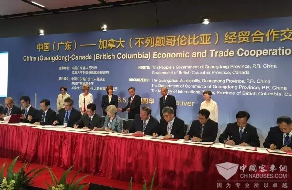 胡春华(后排右三)、许勤(后排右二)以及加拿大政府高官见证比亚迪董事长王传福(前排左四)与圣艾伯特市代表签署大巴订单