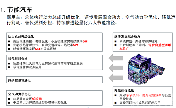 在上述重大目标指引下,路线图进一步凝练关键技术,明晰路径,以新能源汽车和智能网联汽车为主要突破口,以能源动力系统优化升级为重点,以智能化水平提升为主线,以先进制造和轻量化等共性技术为支撑,全面推进汽车产业的低碳化、信息化、智能化和高品质。在此基础上,路线图进一步提出了节能汽车、纯电动和插电式混合动力汽车、氢能燃料电池汽车、智能网联汽车、动力电池、汽车轻量化、汽车制造等七大领域,并分别形成了各自细分领域的技术路线图。