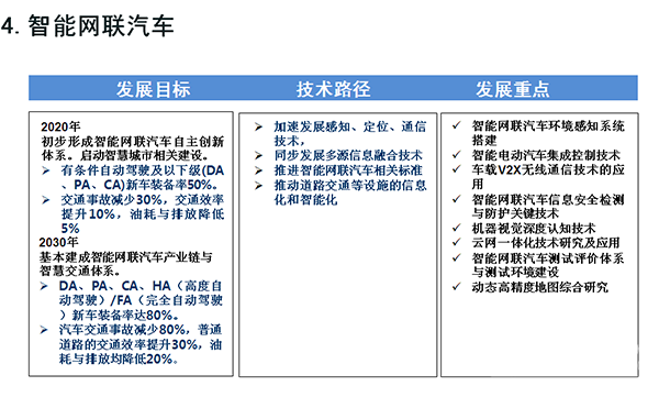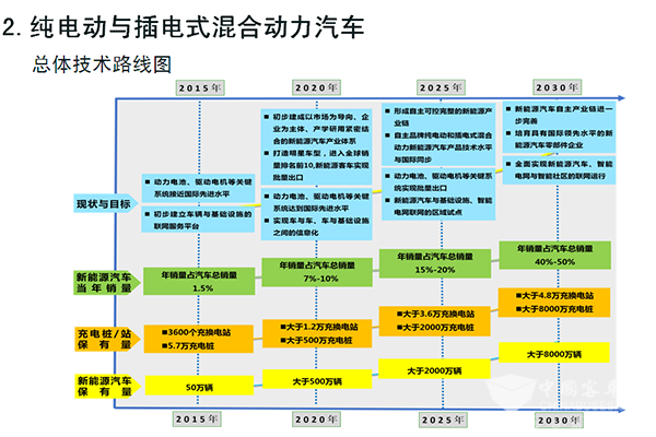 主要里程碑是:至2020年,乘用车新车平均油耗5.0升/百公里,商用车新车油耗接近国际先进水平,新能源汽车销量占汽车总体销量的比例达到7%以上,驾驶辅助/部分自动驾驶车辆市场占有率达到50%。至2025年,乘用车新车平均油耗4.0升/百公里,商用车新车油耗达到国际先进水平,新能源汽车销量占汽车总体销量的比例达到20%以上,高度自动驾驶车辆市场占有率达到约15%。至2030年,乘用车新车油耗3.2升/百公里,商用车油耗同步国际先进水平,新能源汽车销量占汽车总体销量的比例达到40%以上,完全自动驾驶车辆市场占有率接近10%。