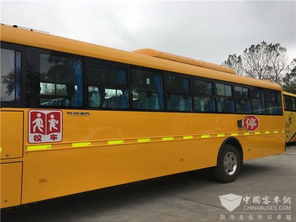 来到白云区一家停车场,记者一眼就看到众多车辆中四台醒目的黄色外观巴士,11米长的巴士车顶上的前后都装置了黄色警示灯,车头除普遍车辆具有的灯置外,车盖前端还有4个增加照明的小灯,左右两侧有两套后望镜,车体上有“校车”标识和可伸缩的“停靠”牌,车辆在停止位熄火的状态,这些灯和标识都会闪烁起来,起到提示作用。整体看上去,校园定制巴士很是霸气、高端、醒目。