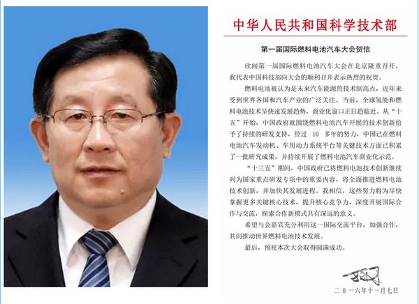 第一天下午(2016年11月7日)的全体大会环节,中国汽车工程学会常务副理事长兼秘书长张进华先生主持,张进华秘书长在介绍与会的国内外嘉宾后,首先宣读了科技部万钢部长为本届大会发来的贺信,万钢部长在贺信中“强调了燃料电池用作汽车未来能源的重要性,概述了国内外燃料电池汽车发展现状,并简要介绍了‘十三五’国家重点研发专项中燃料电池技术创新的重要意义,最后提出了与会嘉宾充分利用本届大会这一国际交流平台,加强合作,共同推动世界燃料电池技术发展的希望”。