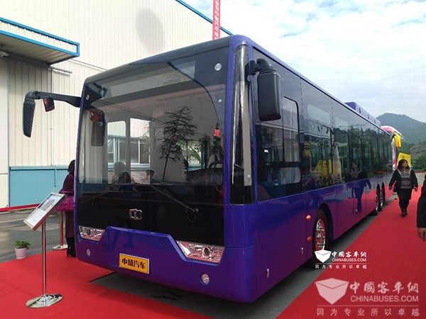 中植汽车成了国内首家在客车领域研发成功的复合材料客车车身的企业。现场展示的碳纤维材料纯电动客车车身、顶棚、左侧围、右侧围和底板均采用碳纤维复合材料,材料部件重量约1.8吨,比钢车身减重约23%。
