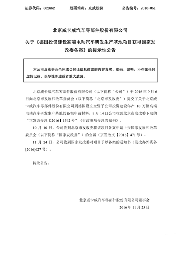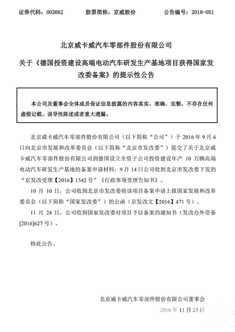 2016年11月25日,北京威卡威汽车零部件股份有限公司(简称“京威股份”)发布公告,京威股份计划到德国设立全资子公司,投资建设年产10万辆高端电动汽车研发生产基地,该项目备案申请已于10月10日上报国家发展和改革委员会,并于11月24日收到国家发改委对该项目予以备案的通知书。