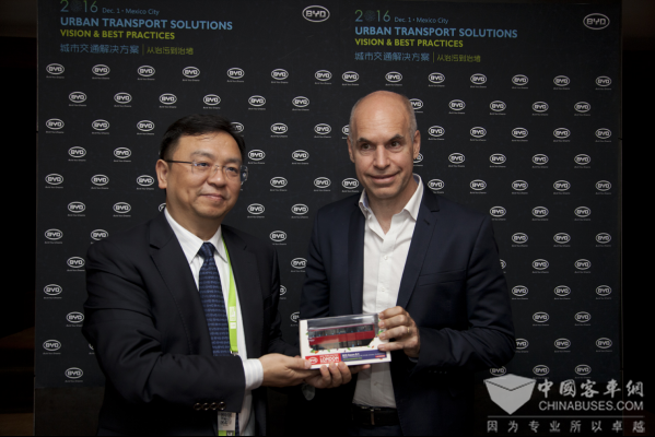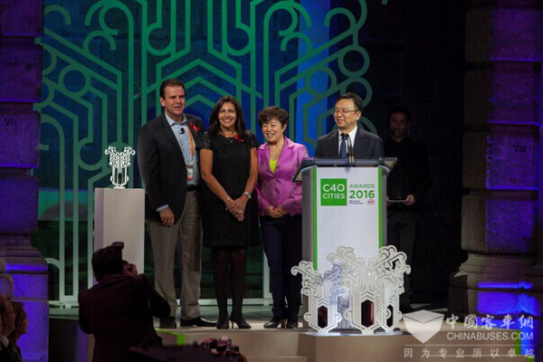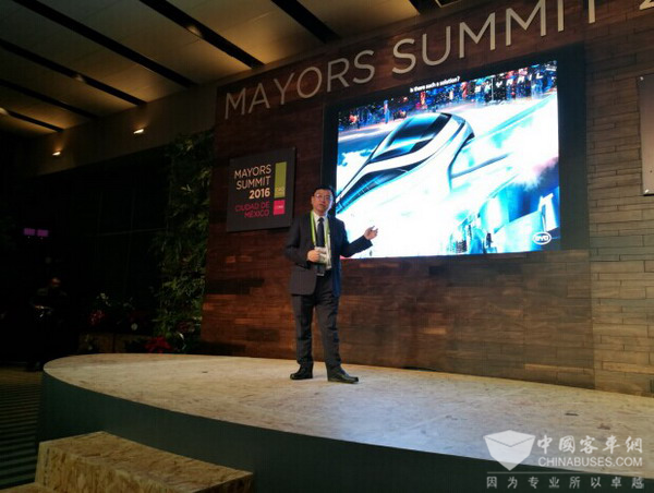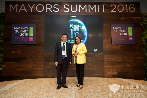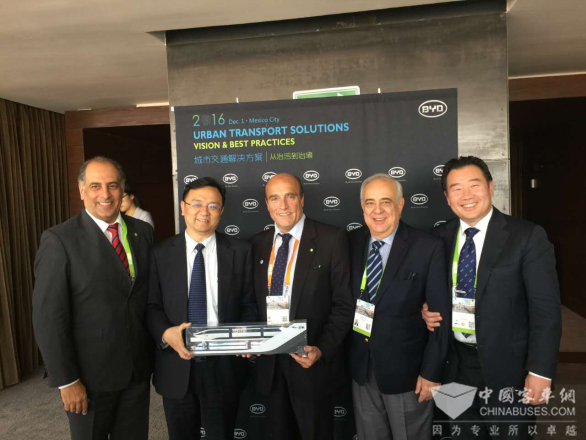 2016年12月1日,全球百大城市市长齐聚墨西哥城,共谋城市发展良策。在大会上,比亚迪集团董事长兼总裁王传福先生分享了 “从治污到治堵”的城市交通解决方案,备受瞩目,特别是独创的“治堵”理念和领先的“云轨”产品,引发众多城市的强烈兴趣。在峰会期间,比亚迪还携手全球百大城市发出“为地球降温1℃”的倡议,并授予巴黎“全球城市领袖奖”,展示出强大的号召力和影响力。