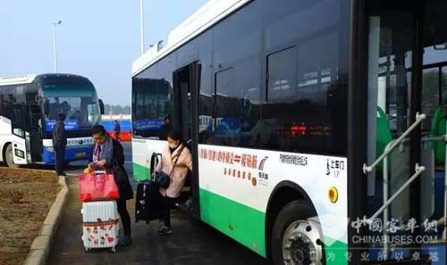 为解决交通中心至T1、T2航站楼间“最后一公里”的地面接驳,省客运集团携手扬子江汽车集团肩负起摆渡任务,旅客乘坐武孝城铁抵达机场后,可免费转乘扬子江纯电动在线充公交车前往航站楼。