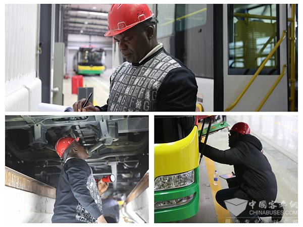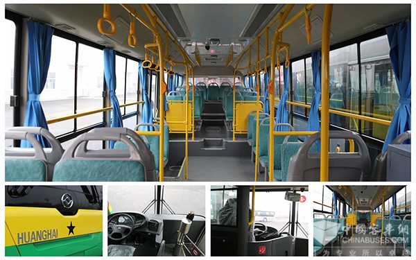 加纳客户认真验收车辆 此次出口加纳的公交车,配置和设施颇为豪华。整车采用了黄海客车经典的车身造型,简洁美观、方正大气;外观涂装以加纳国旗红、黄、绿和象征非洲自由的北极星组成,具有浓郁的国家特色;超大的前风档和侧窗及车内空间,宽敞明亮,为或坐或立的乘客旅途增添了轻松、开阔、观光的心境;发动机后置,双门低踏板(二级踏步),乘客上下方便、便捷。乘客门入口处设置刷卡机和计数器;整车采用黄海自制的成熟底盘,各大总成优选国际品牌,在动力匹配和操控性能上达到最优配置,产品的一致性得到了充分地保证和延续,使得售中、售后、配件供应等方面得到了充沛的保障。