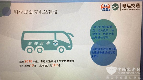 第二,科学规划充电站建设,优化充电设施布局。由于新能源公交车辆续航能力有限,充电或补电受制于配套设施的建设和线网布局。一方面,所属各单位立足当下,集合自身线路特点、运力投放、场地条件,通过科学规划,合理选址,优化充电站场桩位布局,有效地提高了新能源车辆的使用运营效率。另一方面积极争取地方政府对充电设施设备建设规划的支持,解决用地、扩容及输变电建设等问题。截至2016年底,粤运交通应用于公交的集中式充电站约18座,充电桩共约262个。其中所属佛山粤运公交建设的“东平大桥公交枢纽站”项目,是广东省内首个与生产企业联合建立的“快充式新能源客车应用实验基地”,也是广东省节能减排示范项目,成为行业内充电设施建设的标杆。同时我们还要求各单位在新建改造车站、维修厂、停车场时要预留或规划好充电设施用地,并在满足自给自足的情况下,要有适度超前的意识,特别是在充电桩建设从自用变为向社会提供公共服务方面,高速公路服务区也要用心谋划,争取在未来新能源能源供给方面占有一席之地。