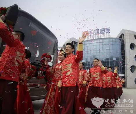在上面所提到的集体婚礼上,值得一提的是,有来自山东济南、莱芜、山西、陕西等地的多位中通客车用户,不远万里来到婚礼现场,不仅带来了当地特色的礼物,还精心准备了精彩的节目,为新人们送上真挚的祝福。之所以来参加婚礼,因为在他们看来,他们与中通客车之间,已不仅仅是单纯的商业合作关系,更是志同道合的伙伴,是共成长的“结合体”。