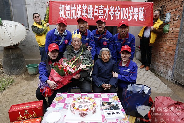 2016年11月6日,是河南年纪最大的抗战老兵卢喜才109岁生日。宇通公司志愿者携带蛋糕、牛奶、棉被等物资驱车200多公里前往濮阳市南乐县为老人贺寿,令老人深深感动。