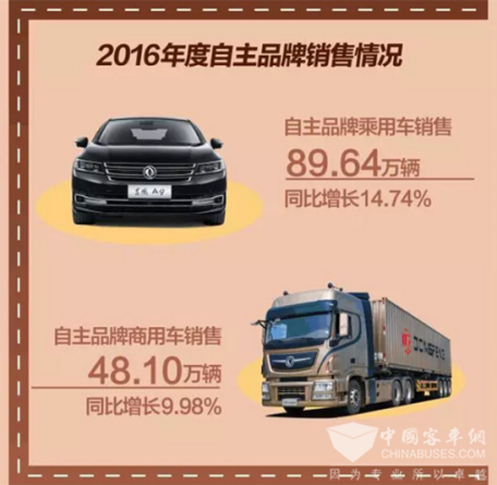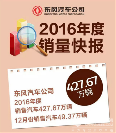 2016年1-12月,东风汽车公司销售汽车427.67万辆,同比增长10.44%。其中,销售商用车49.18万辆,同比增长9.06%。2016年1-12月,东风自主品牌汽车销售137.74万辆,同比增长13.03%,其中自主商用车销售48.10万辆,同比增长9.98%。12月份,东风汽车公司单月销售汽车49.37万辆,同比增长4.17%。东风商用车有限公司销售汽车13.32万辆,其中12月销售汽车1.43万辆;东风特种商用车有限公司销售汽车4.76万辆,其中12月销售汽车0.82万辆。