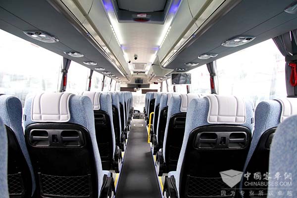 统领客车在车厢前部及中部分别安装有17、15英寸液晶显示屏,供乘客在旅途中选播喜爱的影视作品。另外车内高档冰箱、饮水机、卫生间等生活设施也是一应俱全,在旅途的快意时刻,乘员们可以从车载冰箱中取出可口的食物,犒赏这段属于自己的尊享之旅。统领车厢配置了进口空调及全自动温控暖风系统,它还有一个霸气的名字叫“车内气候系统”,该系统通过多年的试验采集了大量数据,通过车内前后布置的6个传感器设定温度,加之新风系统可以送出6 000 m3/h的新鲜空气,无论是夏季的酷暑还是冬季的严寒,乘客只要登上客车,一切都将回归最令人怡然自得的舒适环境。