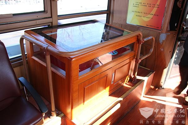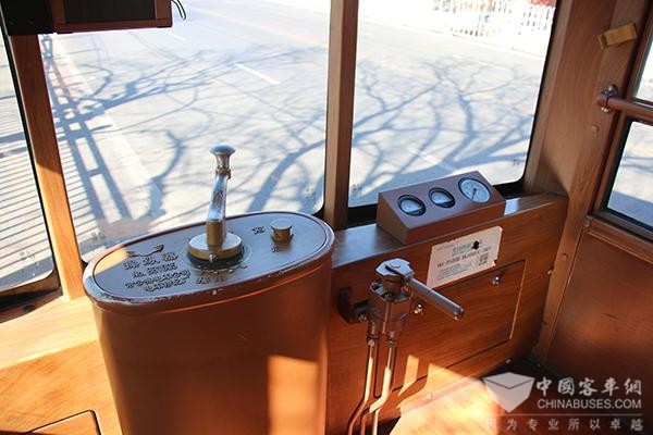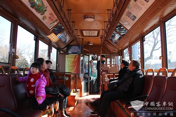 车内一水儿的仿木质装修,驾驶座挡板、地板、墙壁、座位、手环皆为桃木纹,红色皮座椅和镂空造型的顶灯尽显复古风情。车厢入口处两侧设有展示柜,里面放着风车等老北京手工艺品,车厢尾部模仿老电车,设有仪表盘和操作手柄,上空一个铜铃铛,到站乘客一拽,“铛铛”作响。