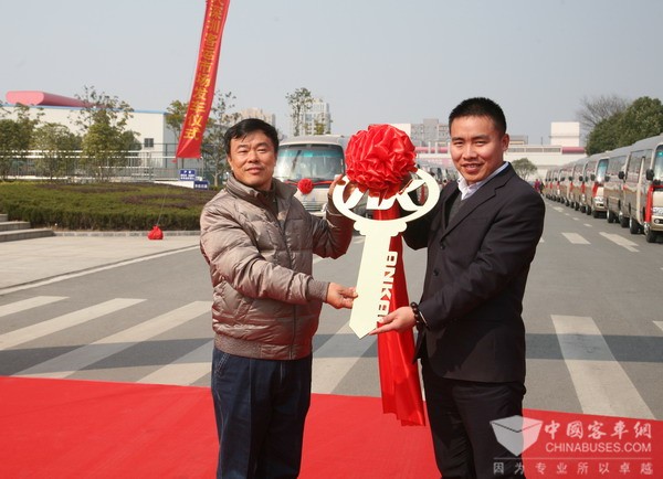 安凯国内营销公司总经理葛帅(右)向深长运副总经理张作辉(左)交付新车钥匙