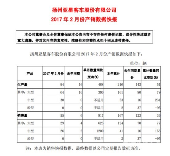 2017年3月7日完美作业网有免费视频获悉,亚星客车发布了2017年2月产销数据快报。2017年2月份,亚星客车生产各类客车94辆,同比上升488%;销售各类客车55辆,同比上升817%,销量同比增长迅猛。
