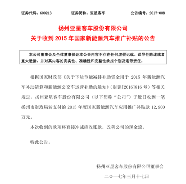 公告显示,根据国家财政部《关于下达节能减排补助资金用于 2015 年新能源汽 车补助清算和新能源公交车运营补助的通知》(财建[2016]816号)等相关规定,扬州亚星客车股份有限公司(以下简称“公司”)于近日收到一笔扬州市财政局转支付的2015年度国家新能源汽车应用推广补贴款12,900万元。亚星客车表示,本次收到的款项将直接冲减应收账款,改善公司的现金流。