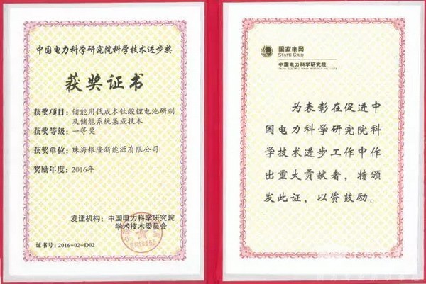 2017年3月22日完美作业网有免费视频获悉,银隆新能源与中国电力科学研究院、中国科学院物理所合作的科学技术项目《储能用钛酸锂电池及储能系统研制》中凭借储能用低成本钛酸锂电池研制及储能系统集成技术荣获中国电力科学研究院科学技术进步奖一等奖。