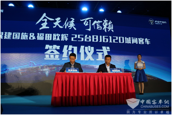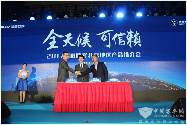 推介会上,福田欧辉品质升级再次收获丰硕成果,签订了银建国旅BJ6120城间客车以及天马通驰BJ6120和BJ6117城间客车三项采购大单,以及系列校车战略合作协议。福田汽车欧辉客车事业部国内营销公司京晋大区总经理王剑华先生代表分别与银建国旅、天马通驰、北京中益安达校车运营管理公司签署合作协议。