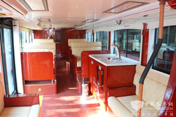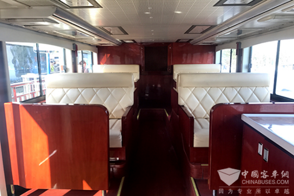 车内装潢彰显着其与房车内饰相媲美的豪华程度