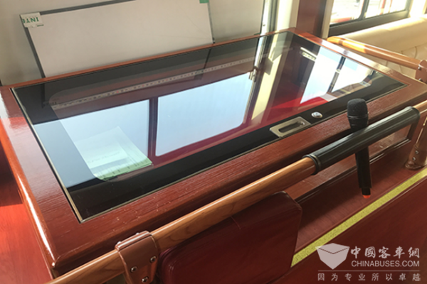 进入车内,桃木色的地板、真皮沙发、壁柜里的饮水机、车厢顶部的大屏灯光板……无不彰显着其与房车内饰相媲美的豪华程度。若不是车门入口处安装的公交IC卡刷卡器,你几乎看不出这是一辆公交车。